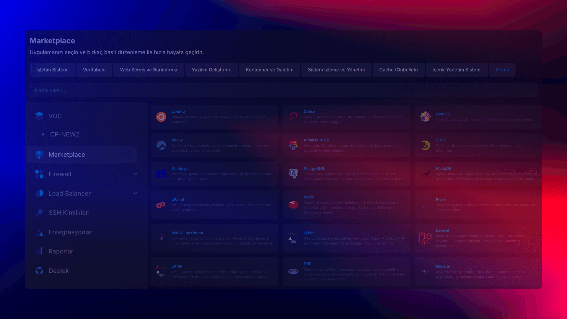Size yayına aldığımız Core Panel'in Marketplace özelliğinden bahsetmek isteriz. Apache'den Nginx'e, Redis'ten Uptime Kuma'ya kadar onlarca farklı uygulama ve servisi bulut sunucunuza saniyeler içinde kurabilir, hemen kullanmaya başlayabilirsiniz.