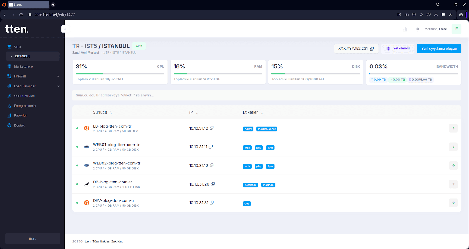 TR - IST5 kodlu veri merkezimizde yer alan “ISTANBUL” isimli VDC ürünün altında yer alan sanal sunucular: