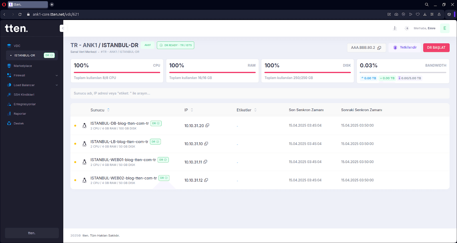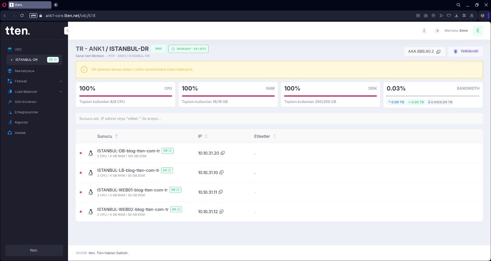 Bu VDC ürününde 5 adet sanal sunucu bulunuyor. LB, DB, WEB01 ve WEB02 sunucuları için DR (Disaster Recovery - Felaket Kurtarma) özelliği aktif edelim.
