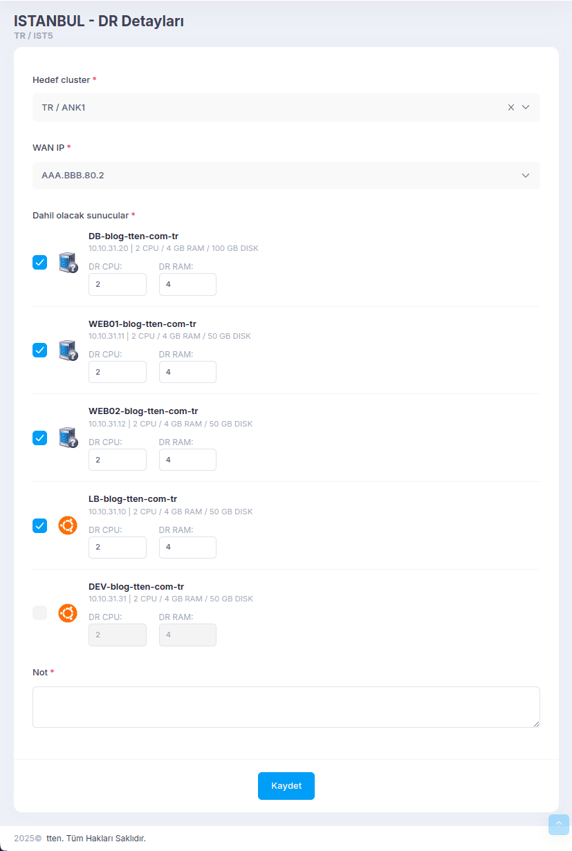 TTEN, ilgili sanal sunucuların DR Ready durumda olması için aşağıdaki ekranları kullanıyor: