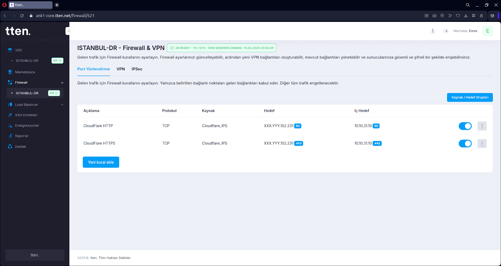 Eğer DNS Zone’larınız CloudFlare’de bulunuyor ise “TTEN Core Entegrasyonlar” alanından API Key’inizin tanımlanması durumunda, A Record’ların güncellenmesi işlemlerini de otomatik olarak TTEN Core gerçekleştirecek!