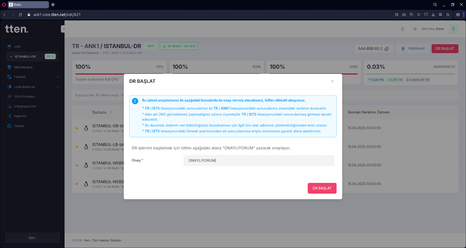 Ancak felaket, TTEN sistemlerini etkileyen ölçekte değil ise IST5 lokasyonundaki Firewall ve sanal sunucuları kapatarak RBD Mirroring işlemlerini durdurmayı ihmal etmiyoruz.