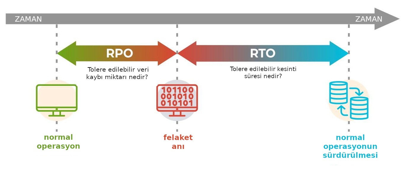 Öncelikle “Felaket Kurtarma” ile ilgili temel iki kavramdan bahsetmeliyiz. Bu temel iki kavram Felaket Kurtarma işleminin başarı kıstasını da belirler. Bu kavramlar: RPO (Recovery Point Objective) ve RTO (Recovery Time Objective)