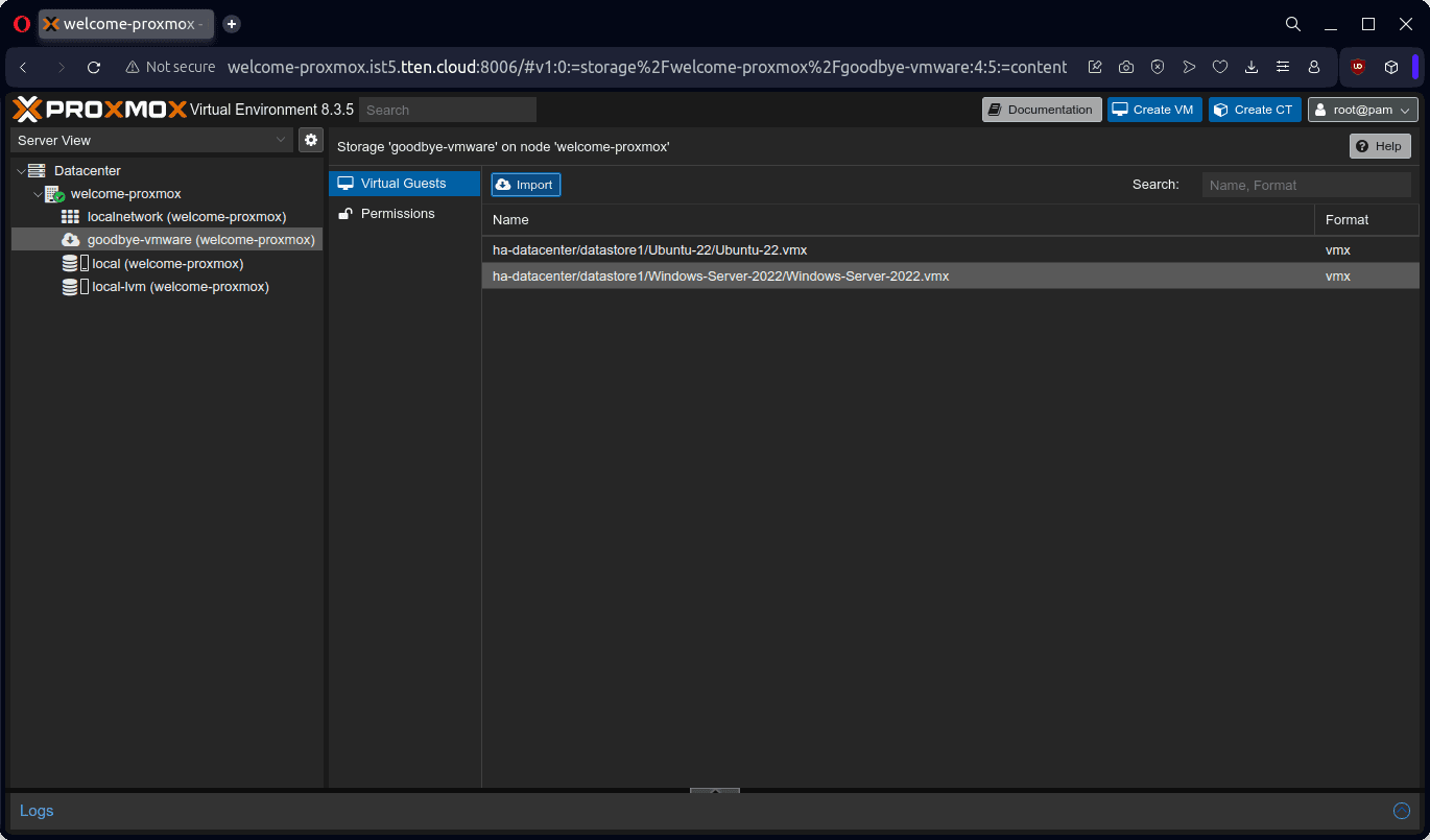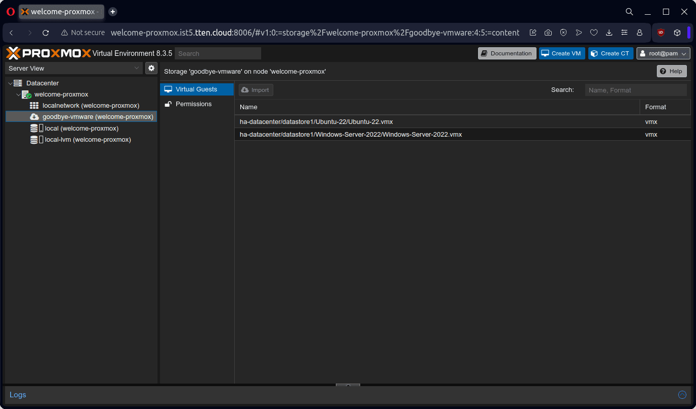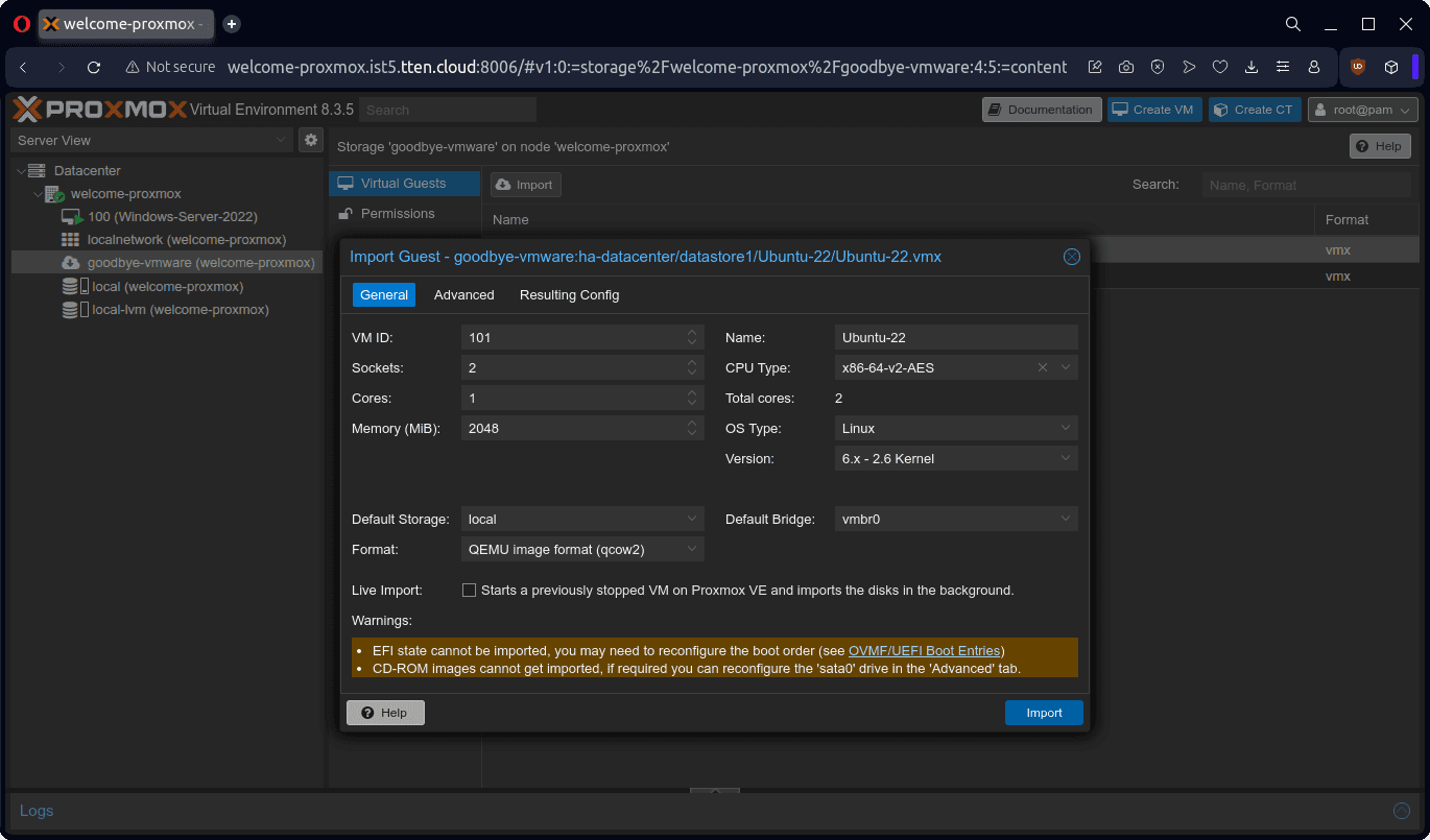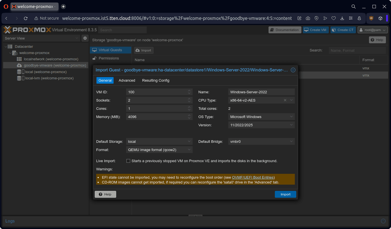 Bu dokümanda örnek olarak bir adet Windows Server 2022 ve bir adet Ubuntu 22 işletim sistemli sanal sunucunun, VMware ESXi 8.0.3 ürünü üzerinden Proxmox VE 8.3.5 ürününe aktarımını gerçekleştireceğiz.