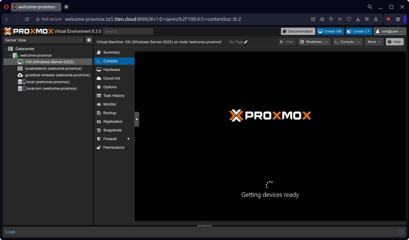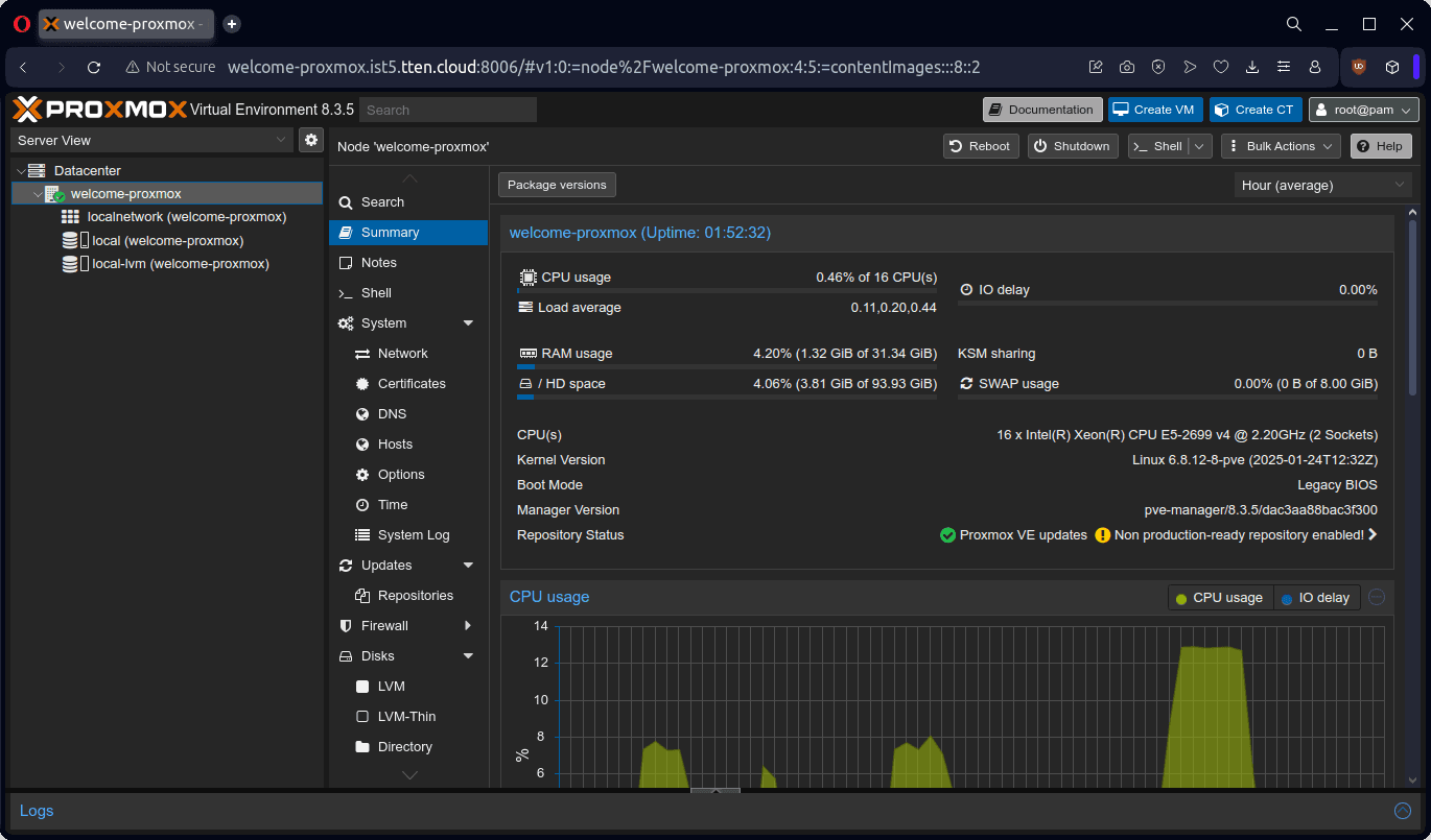 Proxmox VE ortamı: