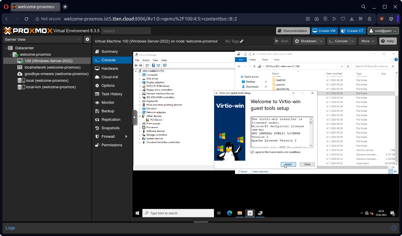 8. Boot sonrası sunucuya erişim sağlanır ve VirtIO sürücüleri ve VirtIO Guest Tools kurulumu yapılır.