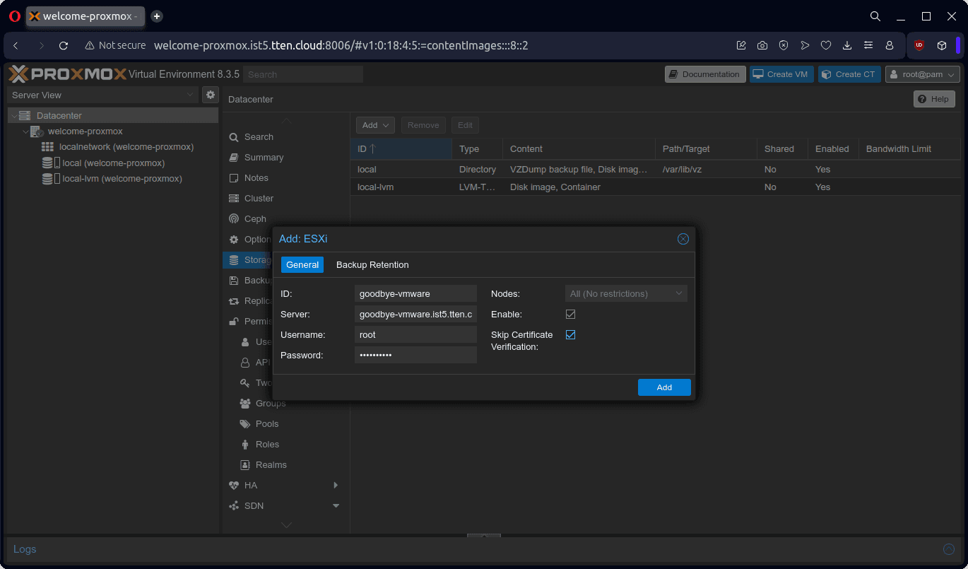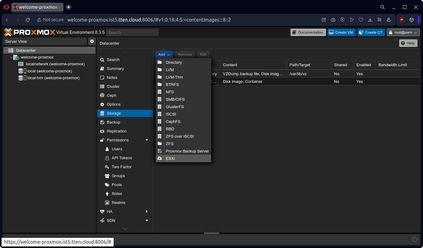 Proxmox VE’ın VMware ESXi üzerinden sanal sunucuların göçünü mümkün olduğunca kolaylaştırmak için sağlamakta olduğu bir servisi bulunuyor. Bu servisi kullanarak, VMware ESXi ürününü Proxmox VE’a bir storage olarak tanımlamamız gerekiyor: