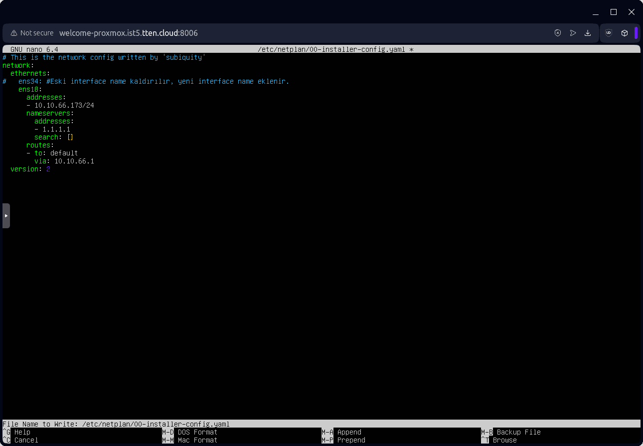 11. Ubuntu için NIC ismi değişmesi kaynaklı gerekli netplan konfigurasyonu yapılır: