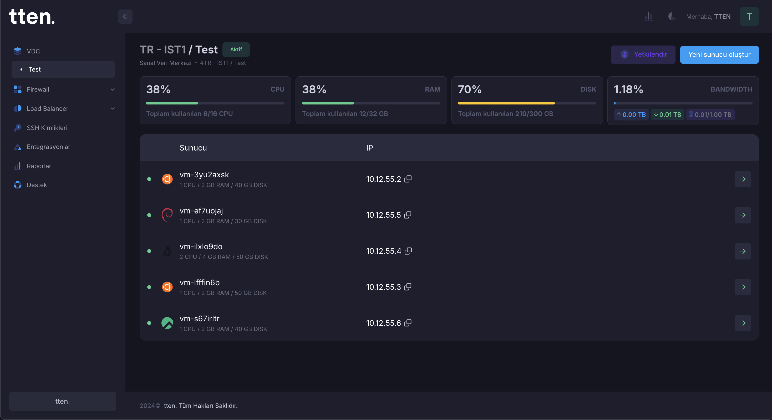 Projenize hizmet eden tüm sunucuları aynı firewall arkasında yan yana konumlandırıyor ve tüm kontrolü size bırakıyoruz. TTEN Core Panel ile mükemmel uyumlu Sanal Veri Merkezini hemen kullanmaya başlayın.